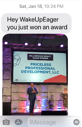 Ryan shared, "Hey WakeUpEager you just won an award." I sat down - stunned into silence and personally touched. I didn't win just any award - I won the Bill Brooks Impact Award! Wow!