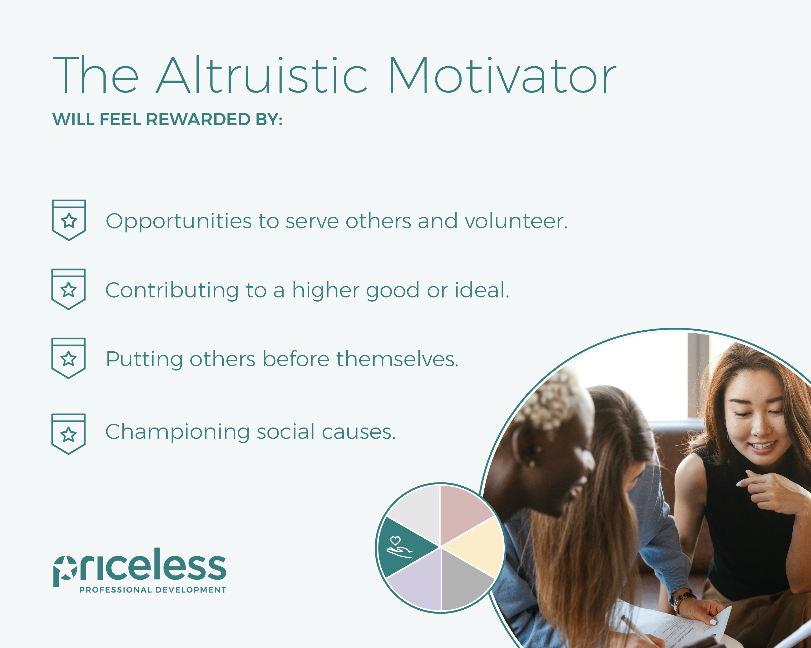 People who score Social Altruistic as a top interest (number one or two) will be energized when they can coach, serve and champion others. (Scroll down for more information.)
